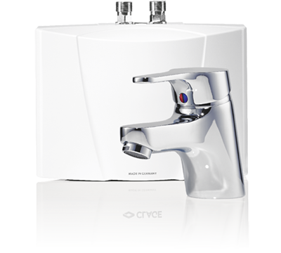 - Malý průtokový ohřívač vody s pákovou stojánkovou beztlakovou baterií, ideální pro umyvadlo. Ohřívač je umístěn pod umyvadlem, propojovací hadice a uzávěr odtoku s táhlem, jsou součástí baterie.