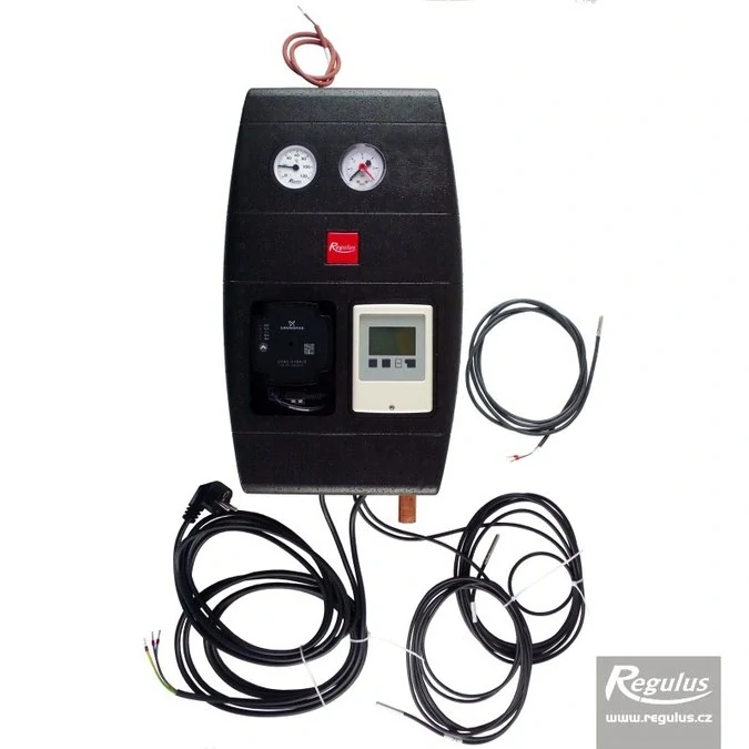 Jednotrubková čerpadlová skupina s integrovaným regulátorem SRS1 T pro 1 solární spotřebič a třemi čidly v ceně, s čerpadlem Grundfos UPM3 Hybrid 7m, se zásuvkou s výstupním napětím 230 V pro připojení topného tělesa o výkonu až 3 kW spínanou HDO a regulací, s ukazatelem průtoku. Napájecí kabel do zásuvky 230 V a kabel pro připojení na rozvod ovládaný HDO.