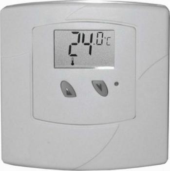Jednoduchý elektronický pokojový termostat s LCD displejem, který zobrazuje teplotu v místnosti a aktuální stav termostatu (zapnut/vypnut). Bateriový 2xAAA