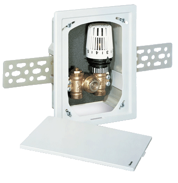RTL hlavice v plastovém boxu (termohlavice reguluje topnou vodu na teplotu podlahového vytápění)